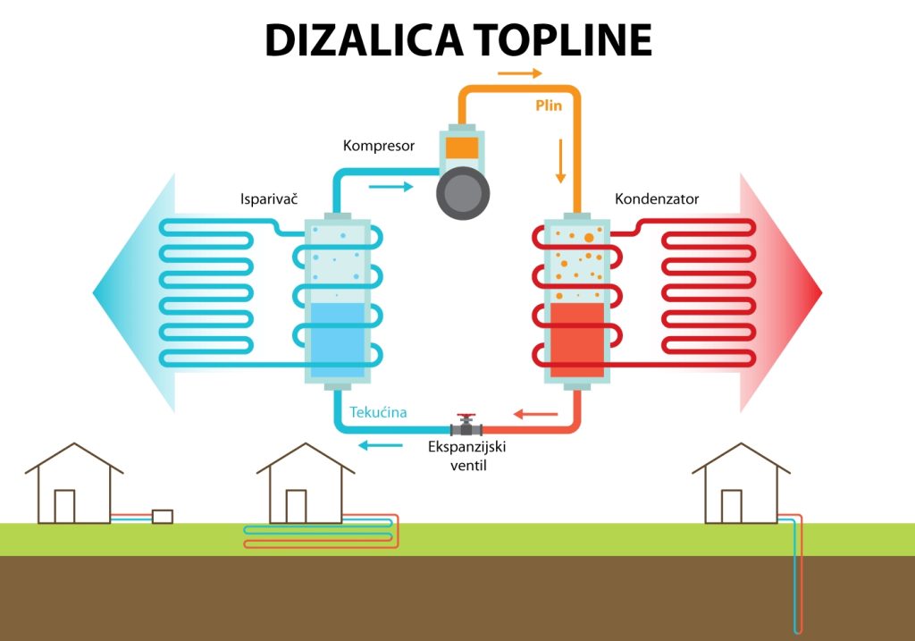 Dizalica topline pretvara energiju iz vode, zemlje ili zraka u iskoristivu toplinu, a pritom troši do 4 puta manje električne energije grijaćih tijela na struju za proizvodnju iste količine topline.